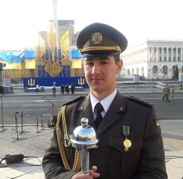 Met zijn 24 jaar is Majoor Ivan Kazmirchuk de jongste dirigent van alle Oekraïense militaire muziekkorpsen. Naast zijn baan als Majoor-dirigent is hij een zeer productieve arrangeur. De meeste arrangementen van het muziekprogramma wat voor u ten gehore wordt gebracht komen van zijn hand en zijn speciaal geschreven voor de bijzondere bezetting die het orkest heeft.